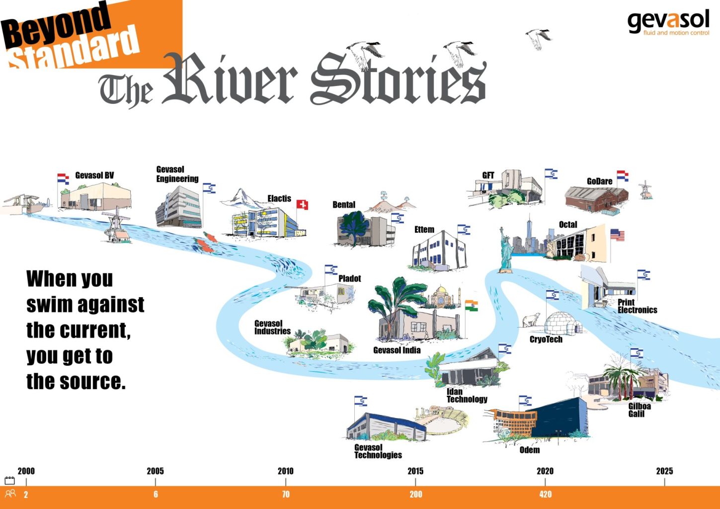 Our Netherlands team has put up a large poster showing scattered Gevasol companies along the shores of a river. Here is the story behind the poster, as told by Gideon Yadin, who co-founded Gevasol at that very Holland location.